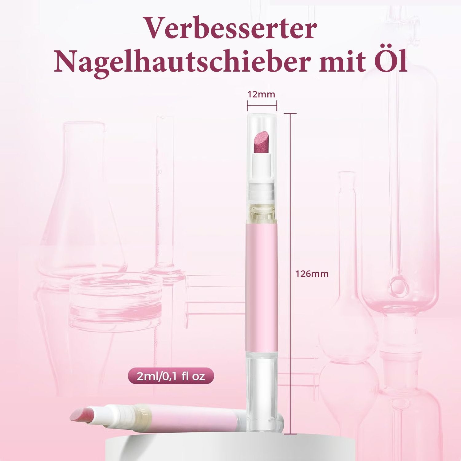 Mit seiner fein strukturierten Kunststoffspitze peelt unser Nagelhautschieber-Ölstift sanft, ohne das empfindliche Nagelbett zu beschädigen.